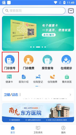1、在本站免费下载该软件,进入软件之后,在首页面可以看到:门诊挂号、门诊缴费、报告查询、在线就诊等,用户选择“门诊挂号”。
