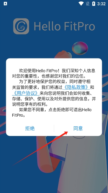 2、进入后阅读并同意Hello FitPro app的用户协议