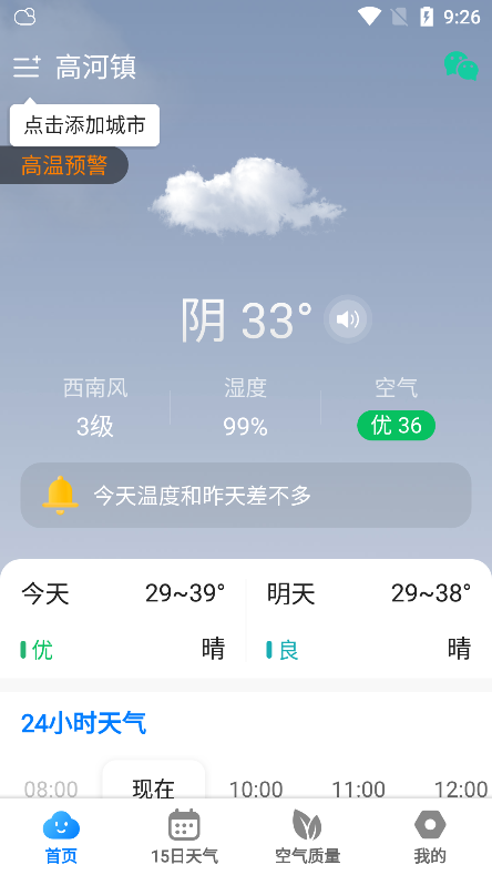 2、查看今日及未来24小时天气详情,了解温度、空气质量;