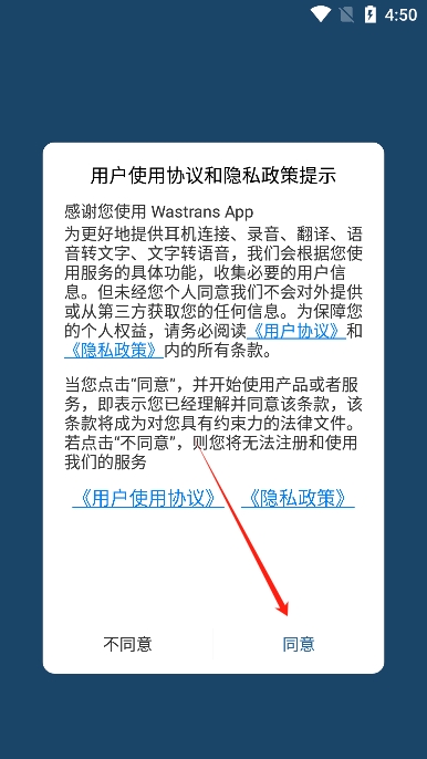 2、进入后阅读并同意WasTrans翻译耳机的用户协议