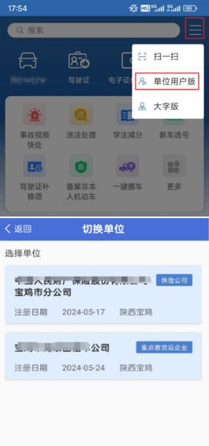 1、单位账号使用人登录本人“交管12123”APP后,点击首页右上角切换至单位用户版。