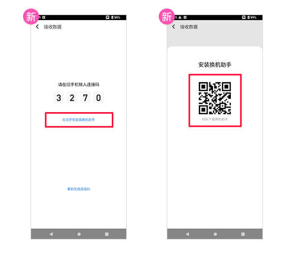 首先在Xperia 新机上打开换机助手应用程序,在换机助手生成连接码的界面,点击“在旧手机安装换机助手”的字样,会跳转至新页面,显示“安装换机助手”的二维码旧手机扫描此二维码即可通过浏览器打开并下载换机助手。下载完毕后,请进入旧手机的下载目录,找到换机助手应用程序并进行手动安装。