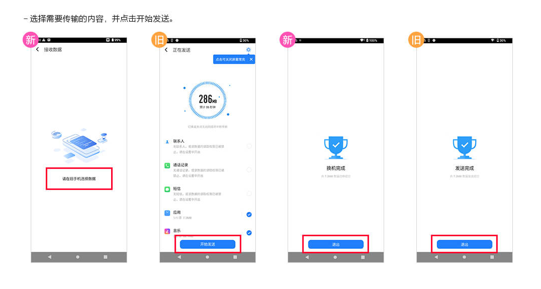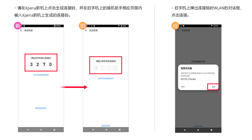 Xperia 定制版“换机助手”应用程序与应用程序Xperia Transfer2完全不兼容。即使您的旧Xperia 手机可能有一个XperiaTransfer2的应用程序,您仍然需要下载换机助手应用程序并安装在你的旧日Xperia手机上以便完成传输。请注意换机助手的应用程序图标,不同的应用程序名称可能都为“换机助手”,但图标不同的换机助手之间不能兼容。请务必在新旧手机上下载安装图标一致的 Xperia 定制版的换机助手应用程序。