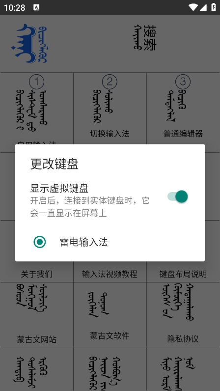 Hani蒙古文输入法app是一款专门为蒙古文打造的输入法应用,通过这款应用能够极大的为广大用户带来便利,这款输入法也是有着众多的蒙古文文字使用,让大家也是能够更加的方便,有需要的朋友现在就来下载吧!