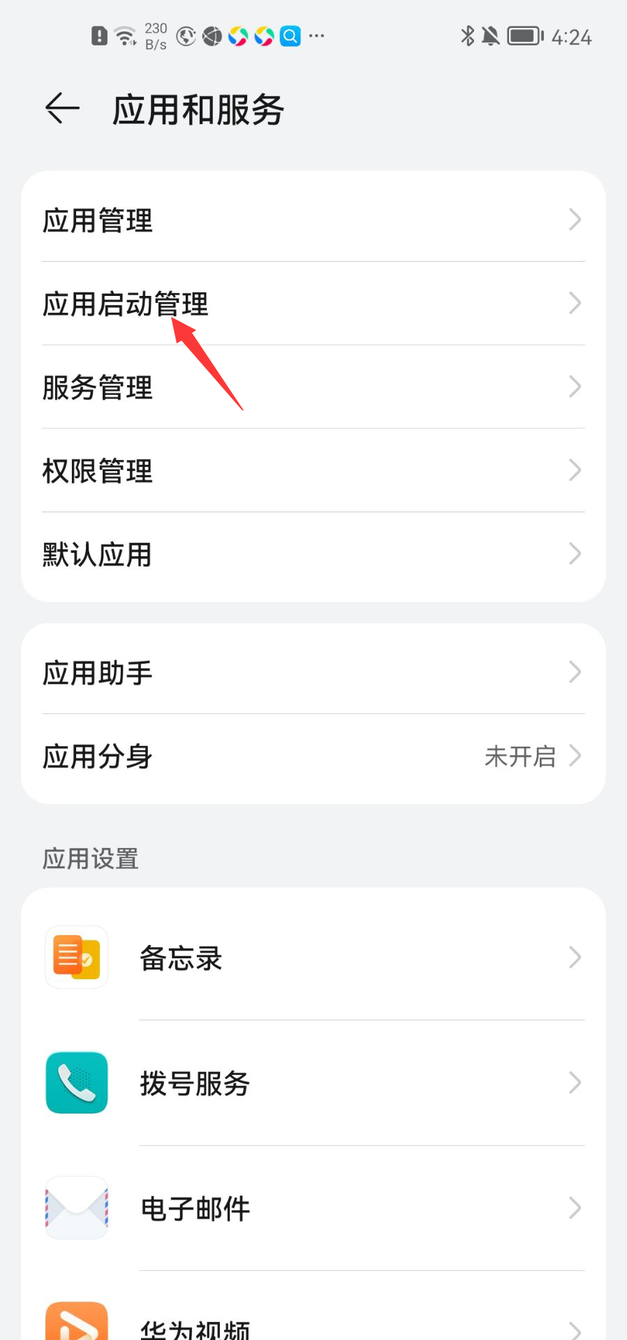 返回设置进入【应用和服务】,进入【应用启动管理】