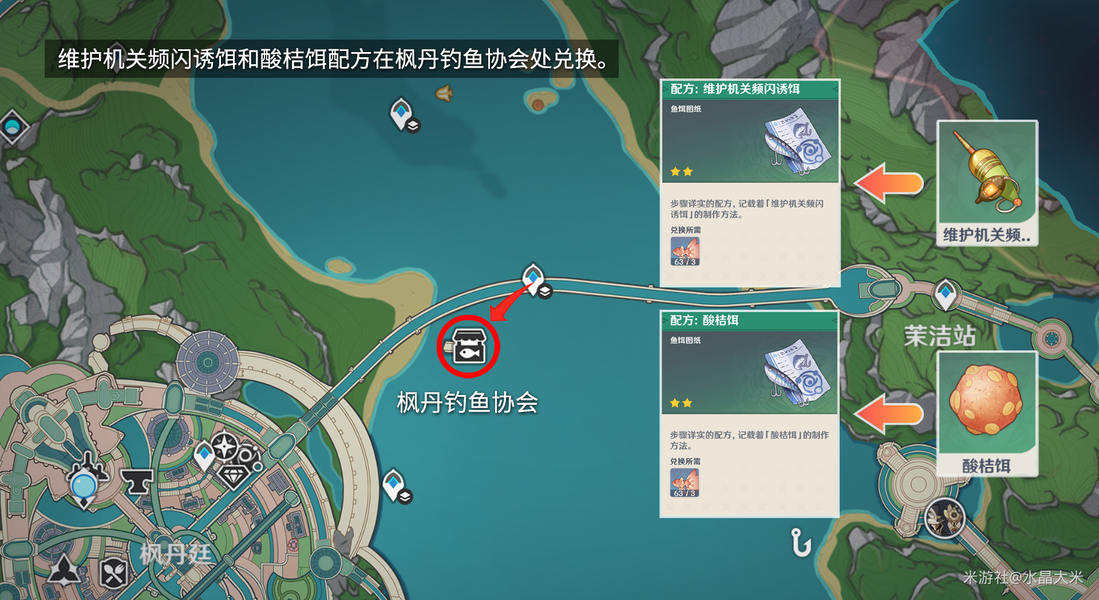 维护机关频闪诱饵和酸桔饵的配方在枫丹钓鱼协会处兑换,甘露饵的配方在须弥钓鱼协会处兑换。每张配方兑换需要三条花鳉,一共需要九条。