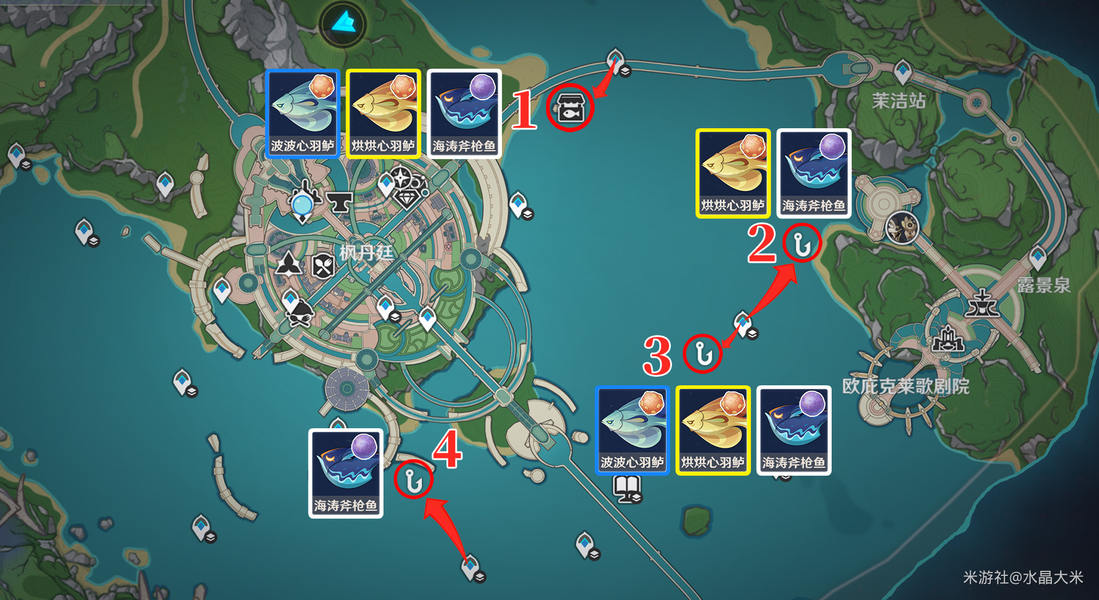 目前枫丹8处钓鱼点,其中维护机关•白金典藏型只在7号钓鱼点出没,其他材料鱼的出没钓鱼点也已在地图上标记。有需要的小伙伴可以收藏保存一下。
