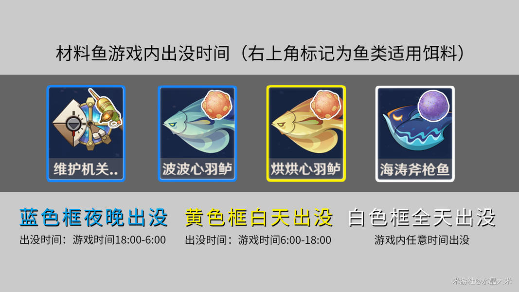 各类鱼群出没时间不同,维护机关•白金典藏型和波波心羽鲈,在游戏内的出没时间为18:00-6:00;烘烘心羽鲈在游戏内的出没时间为6:00-18:00;海涛斧枪鱼会在游戏内任意时间出没。