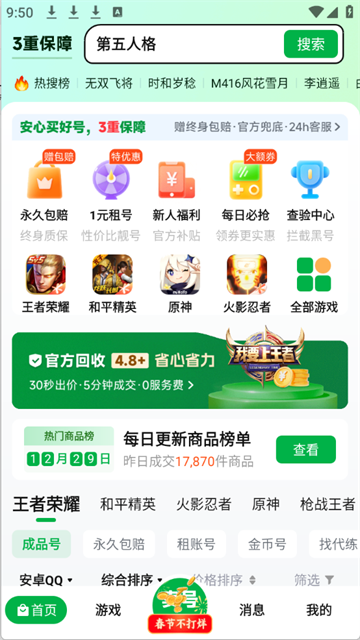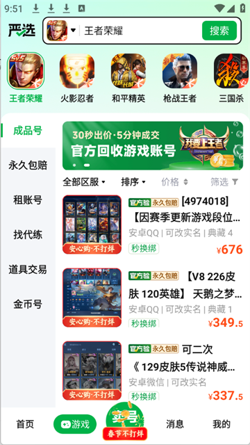 2、首页有很多的游戏账号类型,王者荣耀、蛋仔派对以及和平精英等。