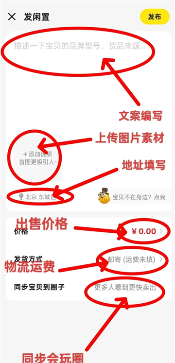 2、接下来就是按流程走:→文案编写→上传图片素材→标明地址→填写出售价格→填写物流运费→添加会玩圈→最后点击发布就可以了