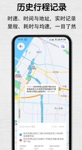 时速、时间与地址,实时记录,里程、耗时与均速,一目了然;