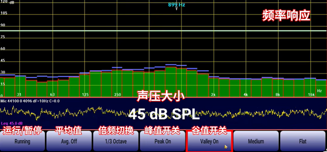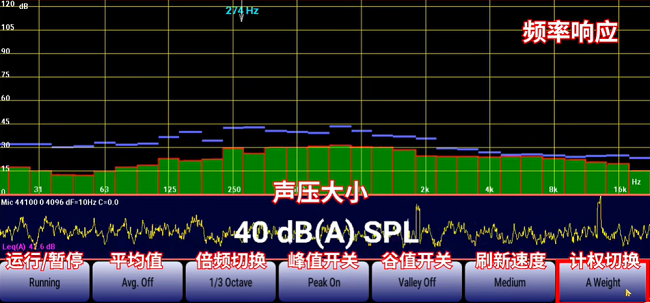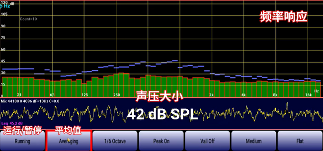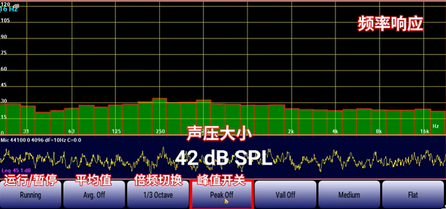 3、软件最上方显示的是当前声音的频率响应,中间显示的是声压大小,底部是软件的主要的操作按键
