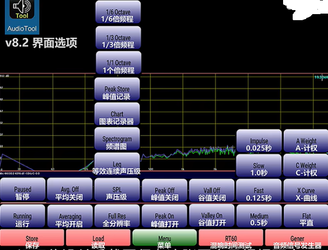 SPL(分贝)计具有 RT60、Leq、Sone、频谱分析仪、频谱图、图表记录器、信号发生器、极性检查器和麦克风校准,AudioTool 对麦克风样本集进行 FFT。通过汉恩加窗减少混叠。实时计算声压级。可以保存光谱,然后加载并与实时光谱一起显示。 “存储”按钮存储当前的实时频谱 - “加载”显示要选择的存储频谱列表,audiotool app可以用于演出测量、家庭影院、音响、汽车等!