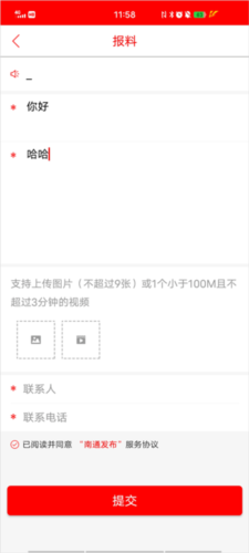 2、进入界面后,输入报料标题、内容以及相关图片联系人等信息后点击“提交”即可。