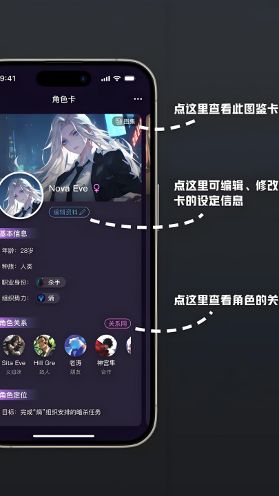 3、还可以编辑图鉴卡的设定信息和关系网;