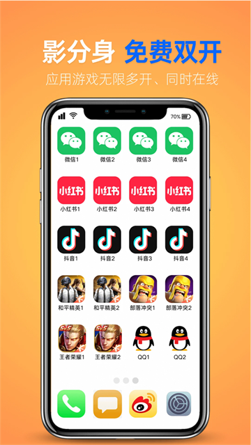 不止应用双开,实现应用三开四开,无限软件分身!影分身应用多开助手实现同时在线,登陆无需切换账号,免费支持微信分身、微信分身版、微信双开、微信多开!