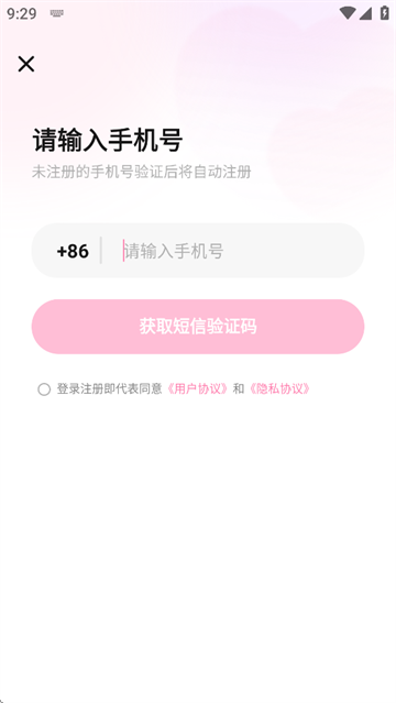输入手机号,验证码,勾选登录注册即代表同意 《用户协议》 和 《隐私协议》,点击登录即可。
