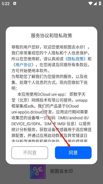 1、在本站下载安装抠图去水印app并打开,阅读相关的用户协议