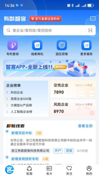 有数智客app最新版是一款非常好用的智能办公软件,这款软件内置拥有超多实用功能服务供大家使用,海量的商机线索实时推荐,方便用户轻松查找商机线索,获取商机资源,更容易的帮助大家来拓展自己的客户来源,感兴趣的小伙伴不妨来本网站下载试试吧。