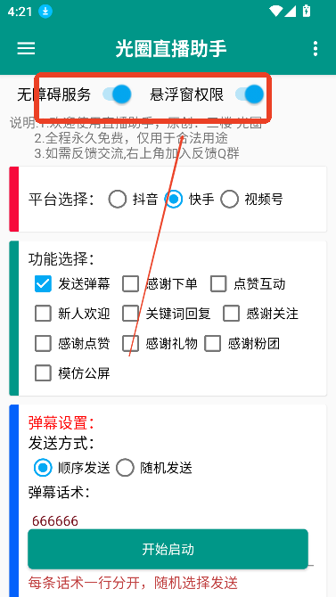 1、进入首页,选择直播平台,给予悬浮框权限;