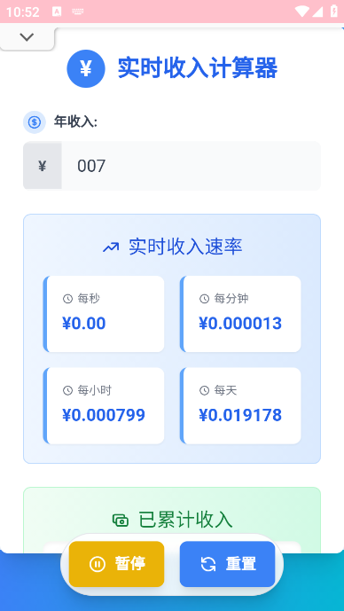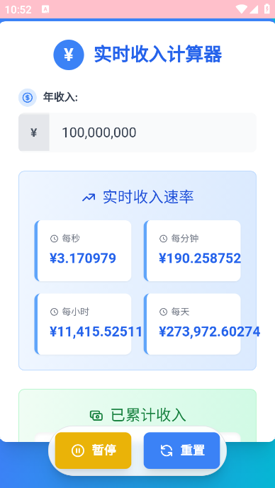 实时收入计算器app是一款非常好用的计算工具软件,这款软件可以帮助大家轻松的来计算实时的收入数据,可视化你的年收入转换成每秒、每分钟、每小时和每天的收入,帮助大家更清楚的了解自己每天的收入来源和金额,感兴趣的朋友快来下载使用吧。