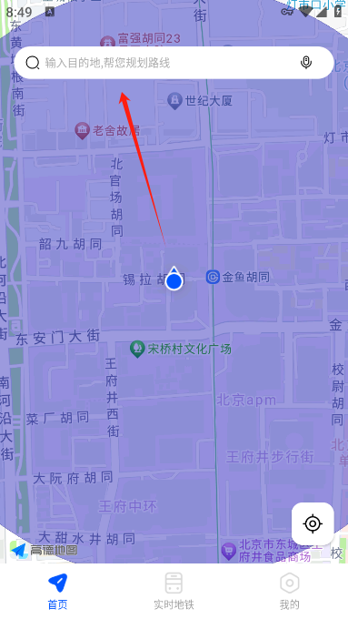 1.进入首页,点击上方的搜索框一键输入目的地,即可自动规划路线进行导航。