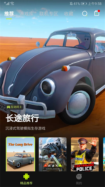 1、打开3A云游,进入应用主界面,包括推荐、游戏库、联机专区和收藏频道,在当前推荐频道可看到系统推荐的不同游戏;