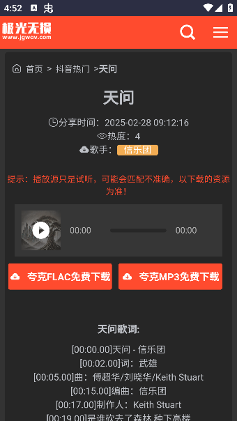 3、总的来说,它作为一个免费的音乐下载平台,为用户提供了便捷的无损音乐下载服务。但用户在享受免费服务的同时,也需要保持警惕,注意网络安全问题。