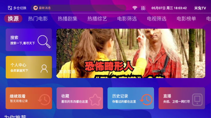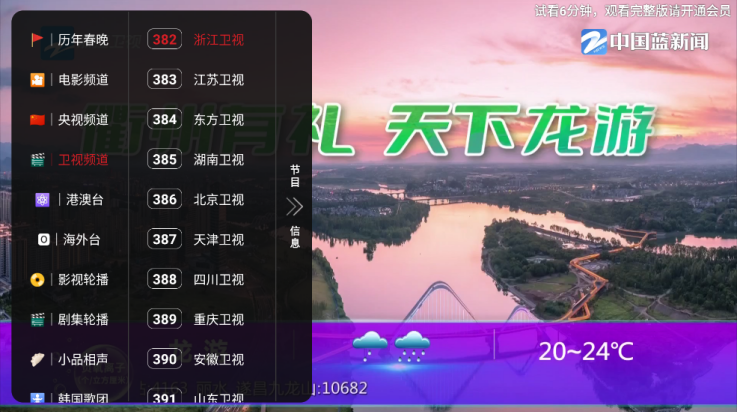 3、点击屏幕可以唤醒菜单,在这里你可以自由切换想要观看的电视频道。