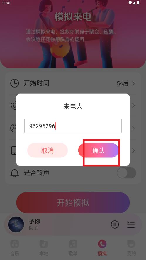 点击模拟,输入开始时间,来电样式,来电人,来电号码,点击开始模拟