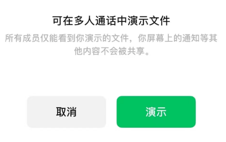 当时的功能说明显示,可在多人通话中演示文件,所有成员仅能看到你演示的文件,屏幕上的通知等其他内容不会被共享。