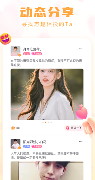 动态分享,找到兴趣相似的TA,研究和发展爱情评估,帮助您找到最适合三方面个性的人。