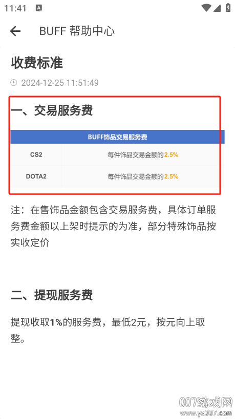 3、然后可以看到手续费介绍了,cs2的每件饰品为交易金额的2.5%,提现收取1%的服务费,最低2元