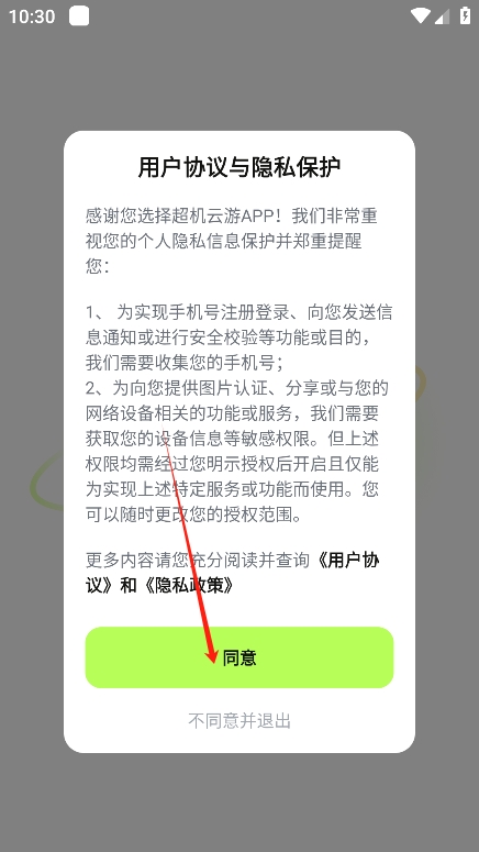 2、进入后阅读并同意超机云游戏app的用户协议