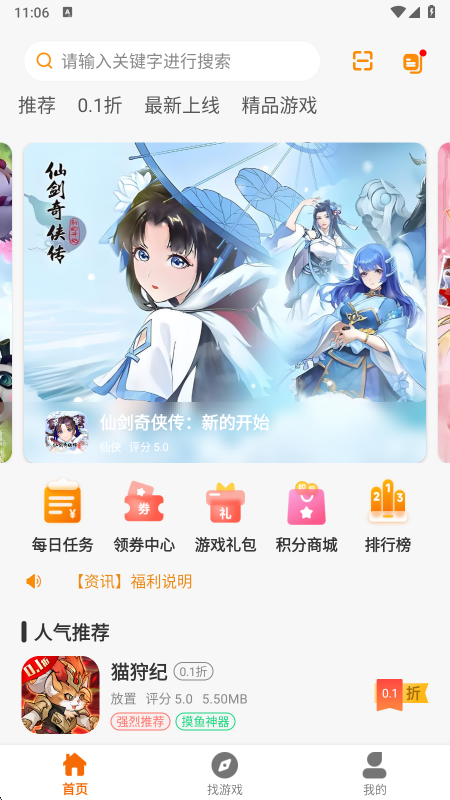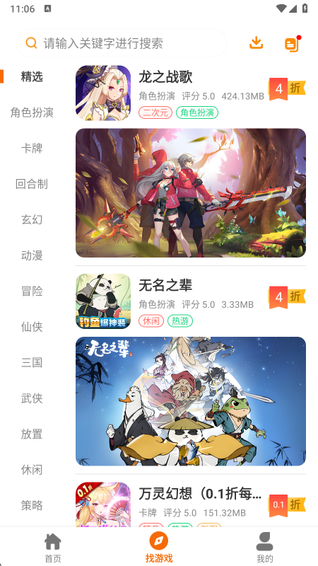 3、找游戏页面将游戏进行了详细的归类,冒险、仙侠以及传奇等类型都有。