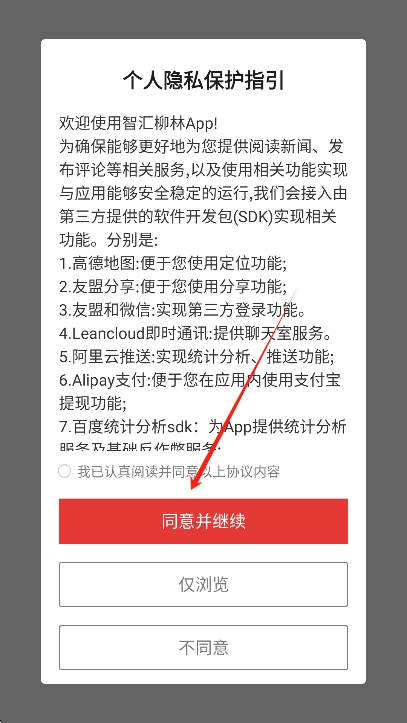1、在本站下载安装智汇柳林app并打开,首先同意智汇柳林app的用户协议