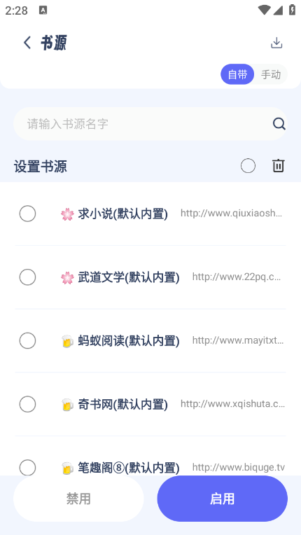 3、最后就能清楚的看到软件自带的书源并自定义添加书源了