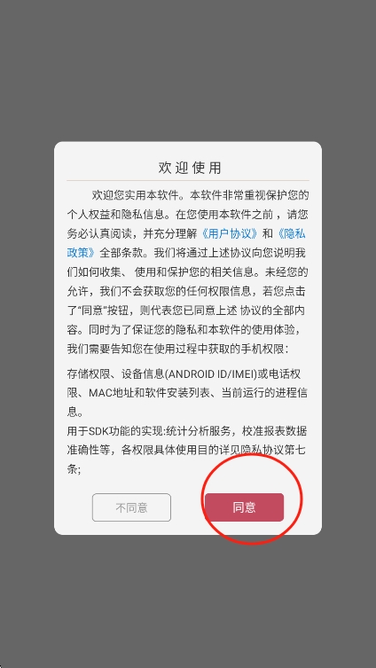 1、在本站下载安装孔雀投屏app并打开,首先同意孔雀投屏app用户协议