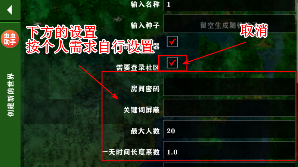 4、记得取消需要登录社区的勾选,设置好房间的类型和需求。