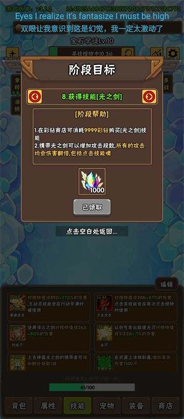 当你开下一难度时你会发现有点吃力,这时候就要攒彩钻买第二神技——光之剑(伤害乘二且独立乘区)