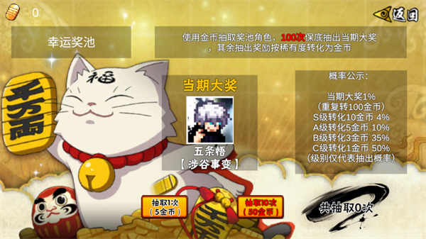 1、新增幸运奖池:可以消耗金币抽取当期限定角色,重复转化为金币。