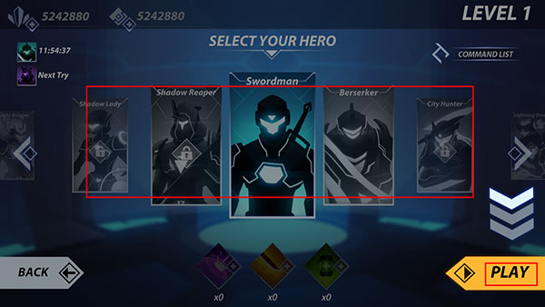 4、英雄是默认的暗影,后期可以用收集的材料购买喜欢的角色,点击“PLAY”;