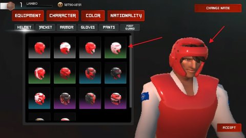 1、打开跆拳道大奖赛游戏,进入角色界面,选择拳击手的外观和运动装备,点击右下角【ACCEPT】;