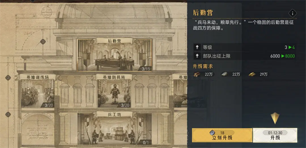 阵容组建完毕,我们就要立马投入打地事业了,首先我们需要了解一个建筑升级资源消耗的规则,1-5级建筑只需要木材;5-10级需要木材和石头;10级以上开始加入黄金消耗。