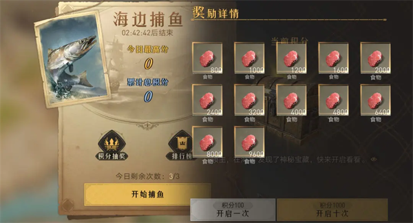 建设码头后,每天可以进行3次捕鱼,积分可用于抽取粮食奖励,加入联盟还有每日排行,一次性获取大量粮食。