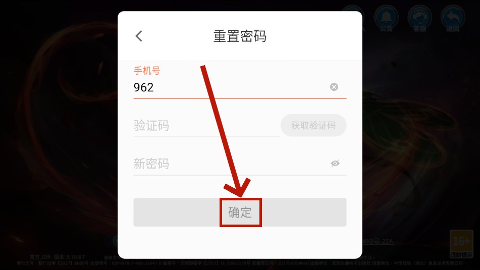 输入手机号,验证码以及新密码,点击确定就能够找回账号了