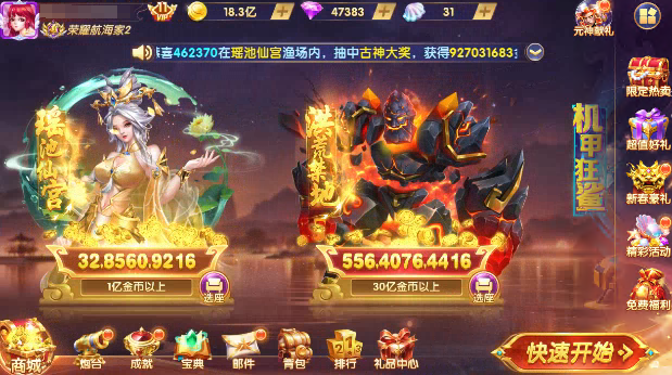 全新的经典模式共有五个房间:阳光浅滩、山海秘境、幽冥深渊、瑶池仙宫、荒古禁地。房间由低级到高级,最大炮值有明显差别,鱼王boss也越来越酷炫!