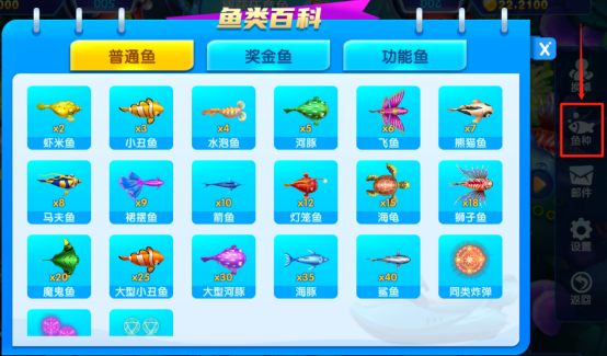 鱼的倍数可以在鱼类百科内查看哦,在渔场内,点击右侧的三角,就可以看到鱼类百科了,每个渔场内的普通鱼都是相同的,奖金鱼和功能鱼有所不同!
