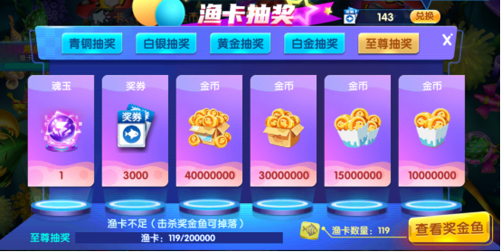 在捕获奖金鱼时,你会收到大量的奖券和渔卡,这些道具用处十分大。渔卡可以用来参加渔卡抽奖,不同数量的渔卡可以进行不同等级的抽奖。