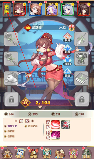 2、然后就可以看到每个英雄啦,还可以帮这些英雄切换装备,提升战力,点击左上方的布阵,进入阵容切换页面。